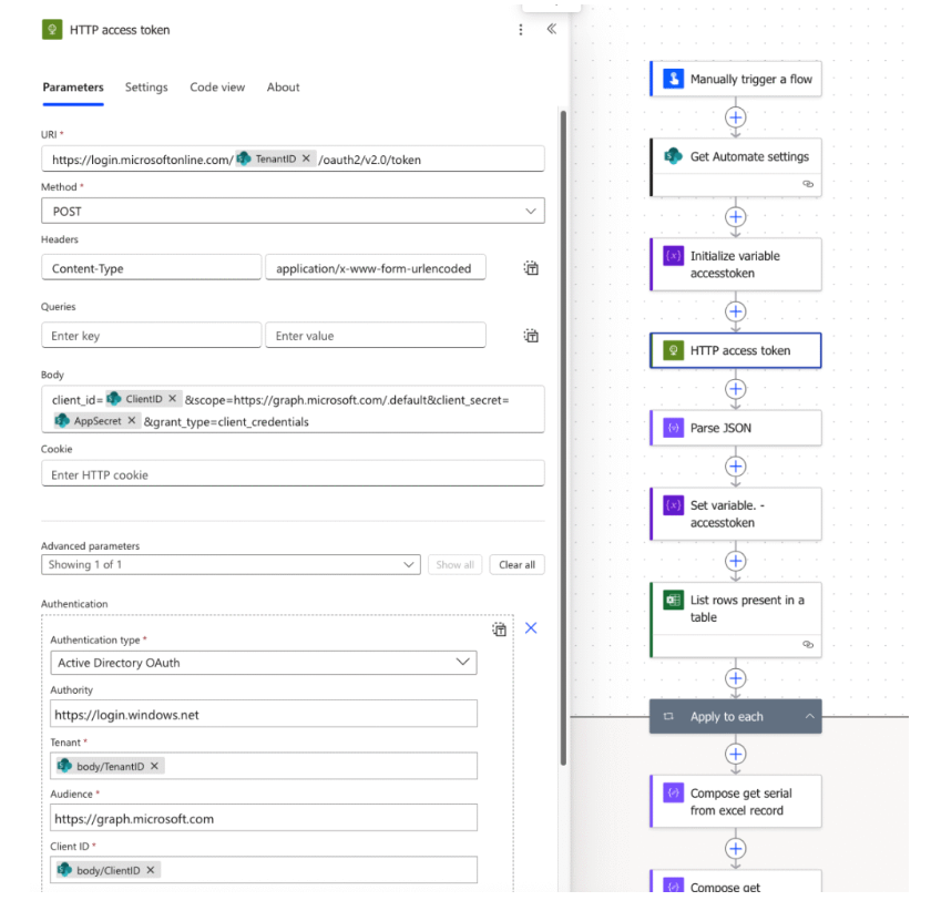 For the ‘HTTP Access token’ step as shown I’m using the Application Registration details already collected to create an access token which provides the necessary permissions to retrieve the device details. The next action is a ‘JSON Parse’ which effectively takes the raw JSON data and transforms it into structured, readable content you can easily work with. The ‘Set variable accesstoken’ step collects the created accesstoken requested which can then be used in the subsequent HTTP actions. You can see the configuration for the HTTP access token step below: