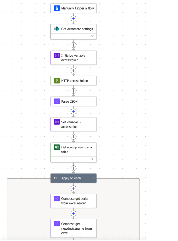 For the solution here, Im using a simple Microsoft Excel document ‘DeviceRenameList‘ as the source to the changes needed. In reality this could be an extract from an asset management system or even be a SharePoint List you maintain. You may even want to dynamically connect to your Asset system using a library connector or custom connector within Power Automate. There are only 4 columns added here but again you could adapt this to your own needs. PLEASE make sure you wrap the data including the header in a table that you name and use in Power Automate.