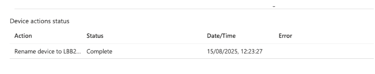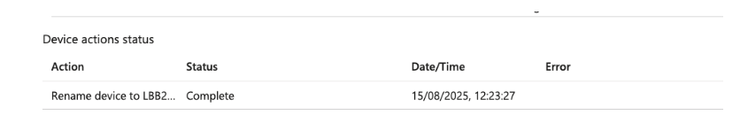 A successful command will appear within the Intune page for the specific devices updated. In terms of the change of name this can take time to take affect within the intune portal. It generally waits until until the device has performed its next synchronisation back to Intune with its telemetry data. As a follow up if doing this in the background you could deploy a popup to the users to inform them to reboot their device. Alternatively you can force a sync from within Intune or sync the device from the Company portal app.