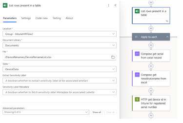 I have stored the device document in a SharePoint document library which then provides you with history and change details to the document. The ‘List rows present in a table’ action along with the ‘Apply to each’ loop will process each of the present rows and cycle through the remaining actions to process the data. See the config to the document below: