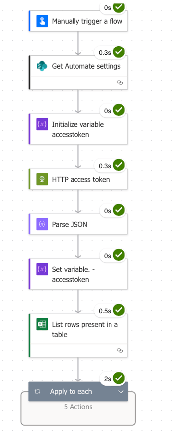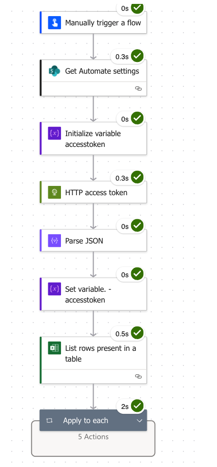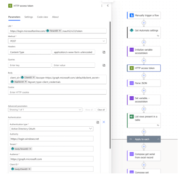Following this the ‘Get Automate settings’ action retrieves my App registration settings I store in a Sharepoint List which contains everything needed. You can either hard code these settings into variables and use these or create a List as I have and retrieve them using the SharePoint GET action.