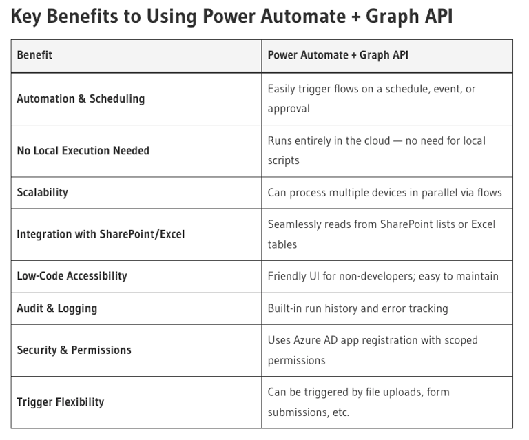 In this blog though as a Microsoft MVP for Intune and M365 I want to introduce you a great alternative, using Power Automate to inject a bit of automation and on-going flexible management. Lets face it unless Intune starts providing an easier way to achieve this requirement then introducing a business as usual process has to be the way around this. PLUS you get to maximise your investment in Microsoft Licensing and easily make changes to fit your company needs.