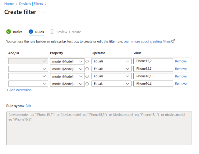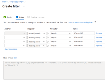 To create a filter navigate to Devices>Filters then select Create and choose ‘Managed devices‘. Add the filter using the device model property and add the relevant iPhone models.