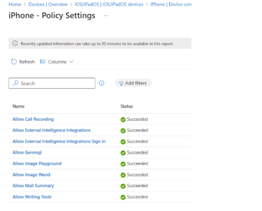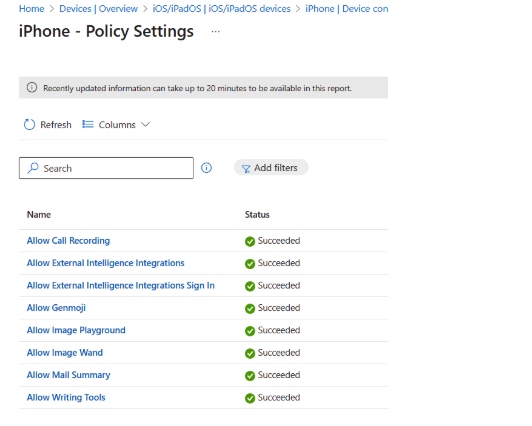 Its worth noting that just because non compatible iPhones cannot use the Apple AI capability, it doesn’t mean the policy will not deploy as per the image below when using my test iPhone XR device. For this reason creating a filter to target settings to compatible devices is advised. The potential impact is that non-functional features could be affected, also the performance of the device may slow the device down or users can experience unpredictably behaviour.
