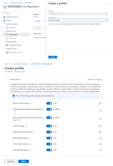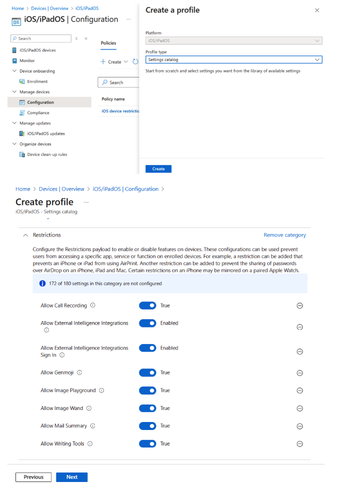 Intune > Devices > iOS/iPadOS > Configuration > New Policy > Create New – Then follow the screens by adding settings. To find the Apple Intelligence settings, search for ‘Restrictions’ and choose those required as included in the above table noting versions and device types.