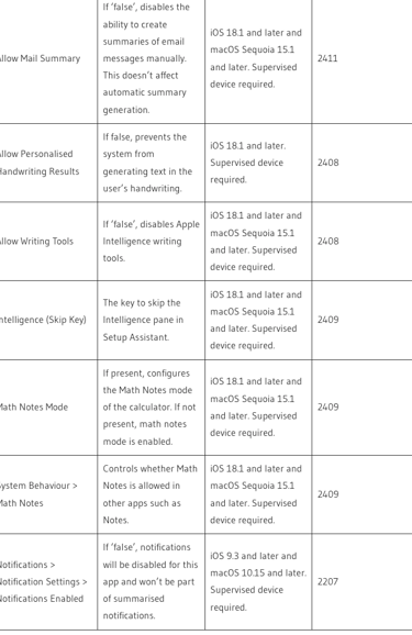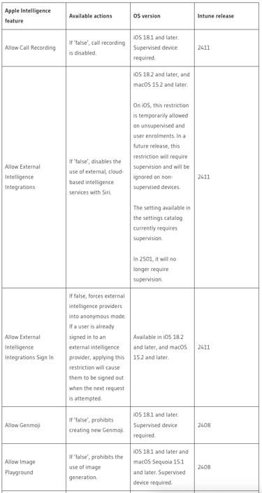 While these are options available for management with Supervised devices, you will see Intune MAM controls in the future. As stated on the Microsoft website ‘only the Writing Tools feature is available in MAM protected applications‘