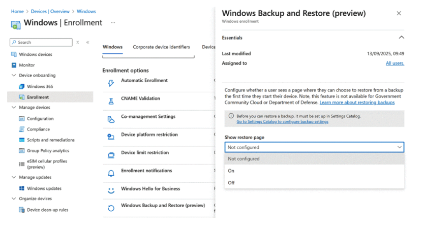 This ensures users see the restore option during OOBE when signing into a new or reimaged device. You’ll notice it shows “All Users” and this is still in preview at the time of writing so check back in your tenant regularly for updates.