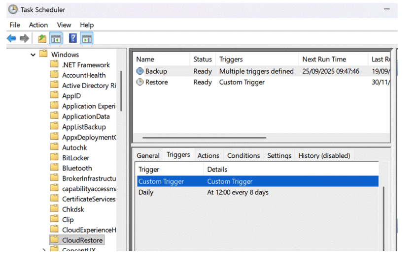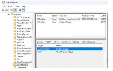 Once configured, a task schedule is setup on the Windows device for backups to run automatically every 8 days, or users have the option to trigger them manually via the Windows Backup app. Within task scheduler find ‘CloudRestore’ for details