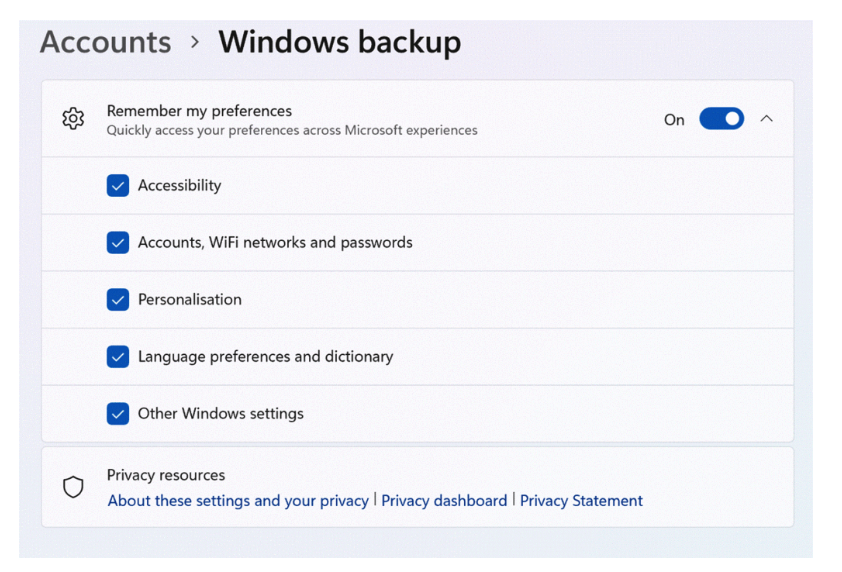 The backup controls can be access through Settings > Accounts > Windows Backup when enabled You’ll also see toggles for: