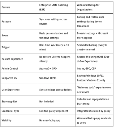 It’s absolutely right to ask this question. Many IT pros are saying Windows Backup for Organisations feels like a rebranded Enterprise State Roaming (ESR). BUT While they share similarities, there are also key differences as shown below.